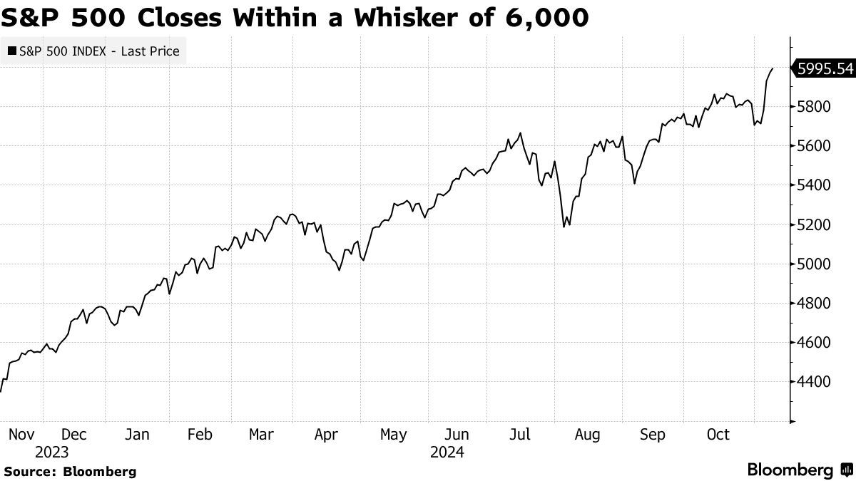 标普500指数盘中一度突破6000点大关。CalBay Investments首席市场策略师Clark Geranen表示:“这是心理上的重要里程碑,可能会吸引更多投资者对股市的兴趣,因为货币市场基金和债市仍有大量资金在观望。”尽管大选后的美股涨势可能会持续下去,但Clark Geranen表示,他不会对股市在年底前再次上涨之前稍作喘息感到意外。