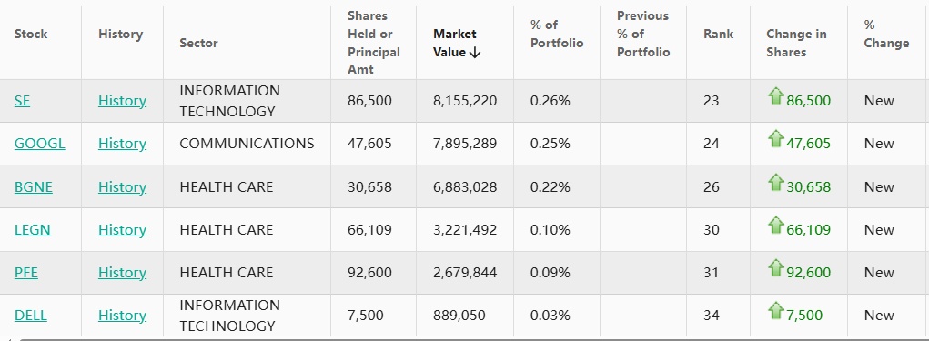景林三季度建仓Sea(SE.US)、Alphabet(GOOGL.US)、百济神州(BGNE.US)、传奇生物(LEGN.US)、辉瑞(PFE.US)、戴尔科技(DELL.US)。