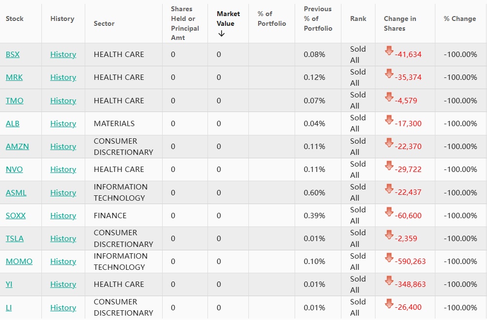 景林三季度清仓波士顿科学(BSX.US)、默沙东(MRK.US)、赛默飞世尔(TMO.US)、美国雅保(ALB.US)、亚马逊(AMZN.US)、诺和诺德(NVO.US)、阿斯麦、iShares费城半导体ETF、特斯拉(TSLA.US)、挚文集团(MOMO.US)、1药网(YI.US)、理想汽车(LI.US)。