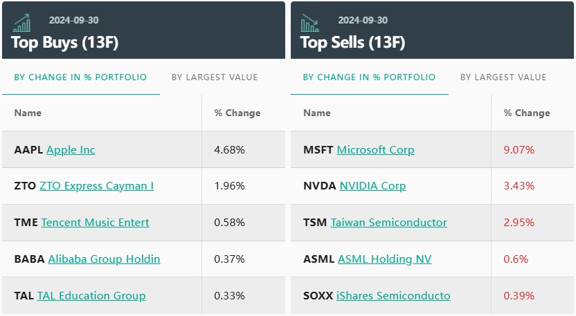 从持仓比例变化来看,前五大买入标的分别是:苹果、中通快速、腾讯音乐(TME.US)、阿里巴巴(BABA.US)、好未来(TAL.US)。