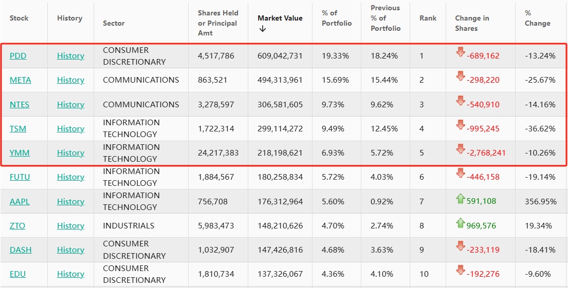 在前十大重仓股中,拼多多(PDD.US)位列第一,持仓约452万股,持仓市值约6.09亿美元,占投资组合比例为19.33%,较上季度持仓数量减少13.24%。