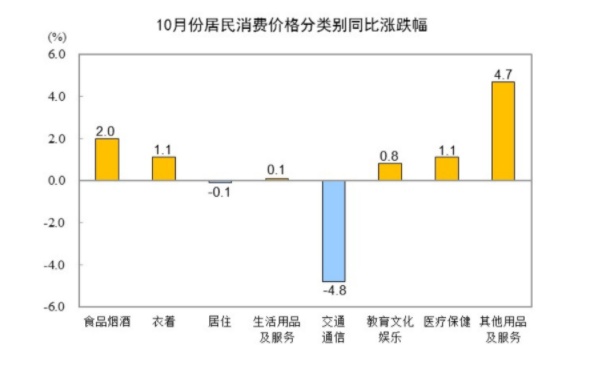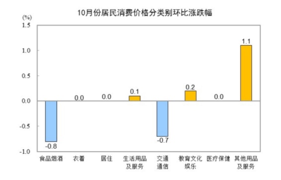 10月份,全国居民消费价格环比下降0.3%。其中,城市下降0.3%,农村下降0.3%;食品价格下降1.2%,非食品价格持平;消费品价格下降0.4%,服务价格持平。