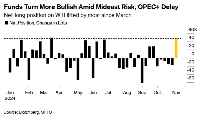 原油长期存在的地缘政治风险溢价早些时候因中东局势可能缓和的迹象而解除。但有报道称,伊朗可能准备通过伊拉克境内的代理人袭击以色列,这使得原油价格重拾涨势。此外,OPEC+在本周决定推迟原定于12月开始的增产计划,缓解了交易员对即将出现供应过剩的担忧,这也为油价提供了重要支撑。
