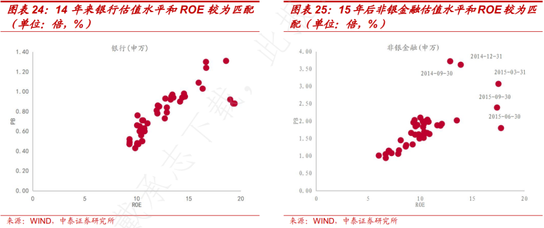 金融行业中银行行业、非银金融行业的 PB-ROE 散点图呈明显的正相关关系,变动关系较为清晰。或说明市场对金融行业 ROE 变化较为敏锐。