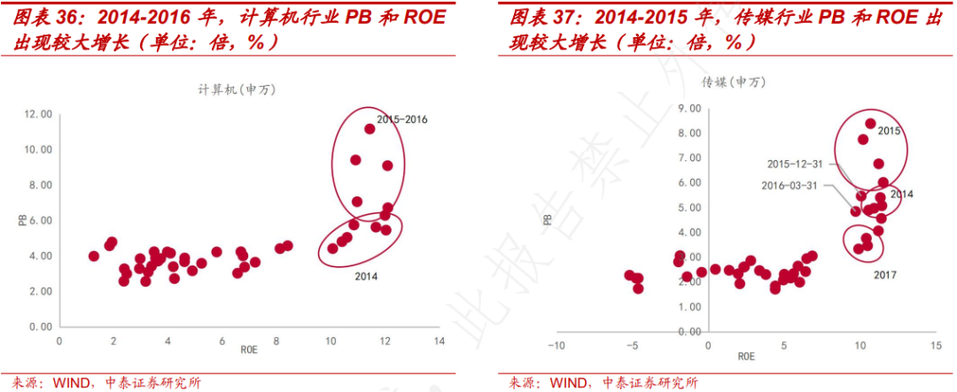 在某段时间 PB-ROE 显著高于或低于其余时间段。如房地产、通信、计算机和传媒行业等。