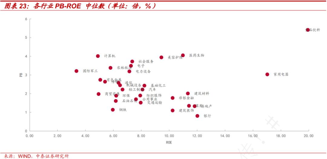 不同类别行业 PB-ROE 散点图呈现出不同特点。目前,申万一级行业的 ROE值中位数集中在 4%-12%,PB 中位数在 1 倍-4 倍之间。房地产及相关行业、家用电器以及金融行业 ROE 中位数相对较高,但市场估值 PB 相对其他行业较低。医药生物和食品饮料行业的 PB 和 ROE 值均相对较高