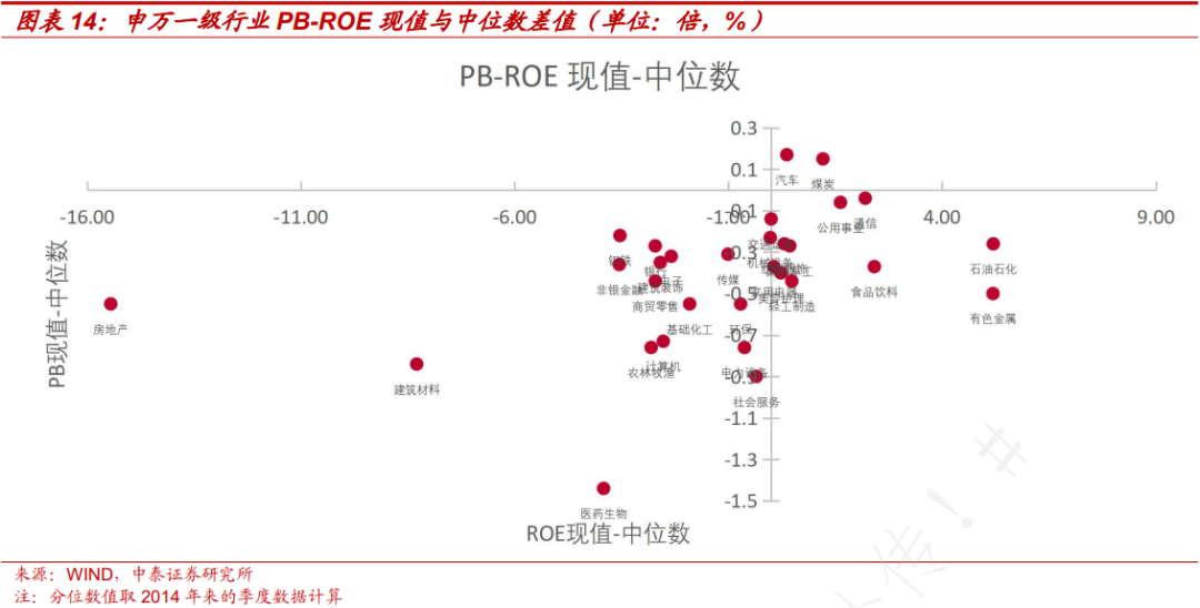 1)PB、ROE均处于低位或均处于高位时,行业可投资价值低。当PB和ROE相对匹配时,获利空间小。同时,PB和ROE均处于历史分位数高值时,存在购买价格较高且业绩增长困难的情况,其投资性价相对均处于低位的资产更低。可以适当关注PB、ROE均处于低位的资产的改善情况。