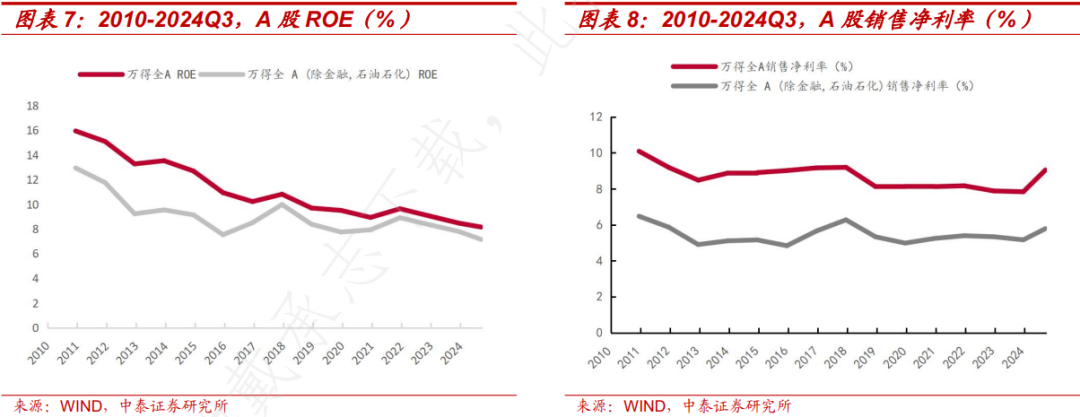 全A股在2024Q3 ROE(TTM)为8.14%,较二季度上升0.12个百分点;全A非金融石油石化2024Q3 ROE(TTM)为7.15%,较二季度下降0.13个百分点。从杜邦分析上看,A股除金融石油石化ROE下降主要受到总资产周转率影响。