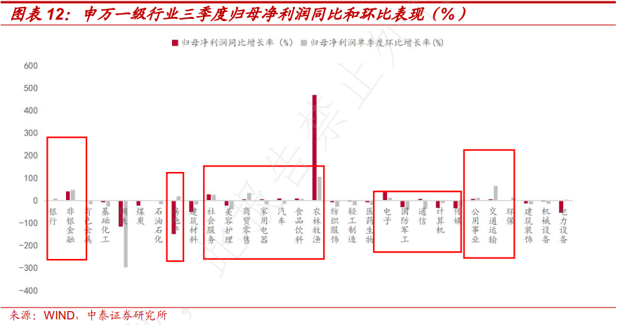 随着政策对上市公司监管的进一步加强、对中长期投资的提倡、国有企业和财政改革的推进,稳健类资产以国有企业占比高、红利高、逐步市场化等特征受益。公用事业行业和交通运输行业营收环比出现改善,第三季度营收环比增长16.8%和1.9%,归母净利润环比增长13.3%和65.7%。