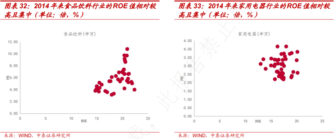 消费板块中的食品饮料和家用电器行业,ROE 相对其他行业较高且集中。