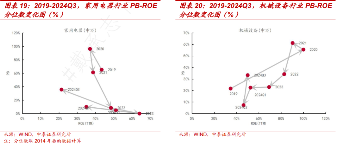 消费类行业ROE改善最为明显的是农林牧渔行业,其三季度ROE分位数达到57.1%,提升了37.6个百分点。其余居民占主导的消费行业,如家用电器随着国家家电补贴、以旧换新等政策的出台,市场积极情绪偏多,估值分位数改善明显,2024Q3增长31个百分点,但ROE分位数水平下降30个百分点。从历年情况看,二季度家用电器行业的ROE分位数并不处于历史较高位置,或说明居民消费不及预期。