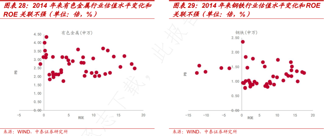 有色金属、钢铁等金属类和煤炭、石油石化等能源类的 PB-ROE 关系不明显,PB 值较为集中,随 ROE 变化不明显。