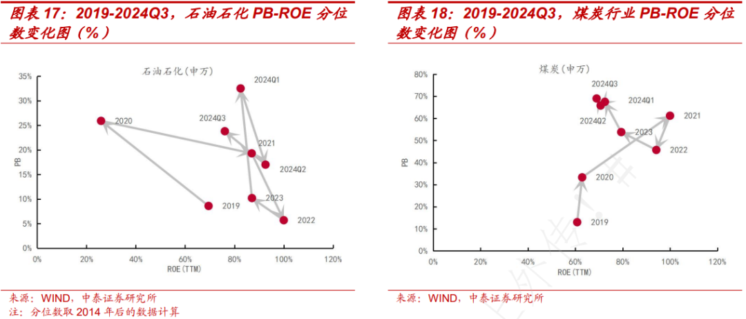 能源板块ROE分位数普遍下行,但依旧维持在中上水平,PB分位数较低。石油石化行业三季度ROE分位数为76.1%,下降16.5个百分点,PB分位数增长7个百分点。市场对二季度业绩的反应在三季度有所体现,估值有所修复,但就近年数据看,仍未达到合理区间。