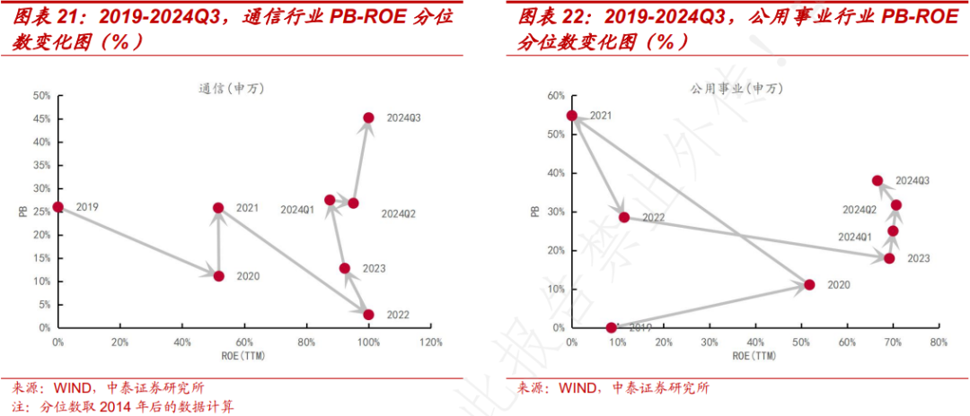 稳健板块中公用事业和交通运输行业的 PB-ROE 图像也呈现一定的相关关系,但不如金融行业明显。