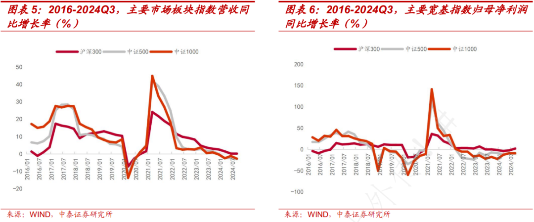 分市值看,大盘股占优。以沪深300为代表的大盘股2024Q3营收同比增长0.22%,较二季度上升0.01个百分点,归母净利润同比增长率1.86%,相较二季度增长4.1个百分点;以中证500为代表的中盘股2024Q3营收同比增长-2.95%,较二季度下降0.65个百分点,归母净利润同比增长-10.90%,相较二季度下降2.24个百分点;以中证1000为代表的小盘股2024Q3营收同比增长-2.7%,较二季度下降1.54个百分点,归母净利润同比增长-9.66%,相较二季度下降0.59个百分点;