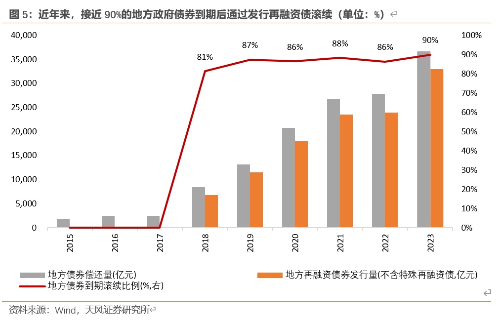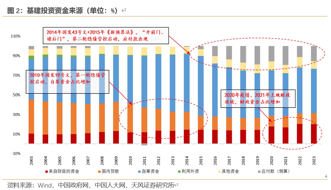 大规模化债虽然没有改变地方政府的总债务规模,但通过调整地方债务结构,减轻地方债务偿还压力,提高城投对基建的配套能力。在基建投资的资金来源中,财政资金只占一小部分,其余的大部分是财政以外的配套资金,往往需要直接或者间接通过城投来完成。