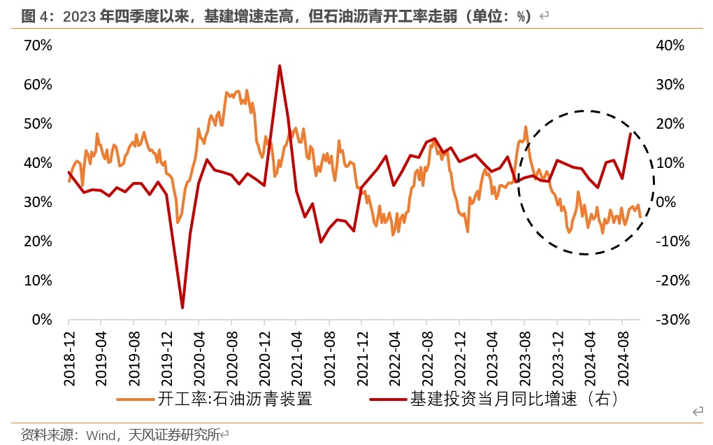 再比如,2023年四季度以来,虽然基建投资增速震荡走高,但曾经与基建投资高度正相关的石油沥青装置开工率,反而持续处于低位。