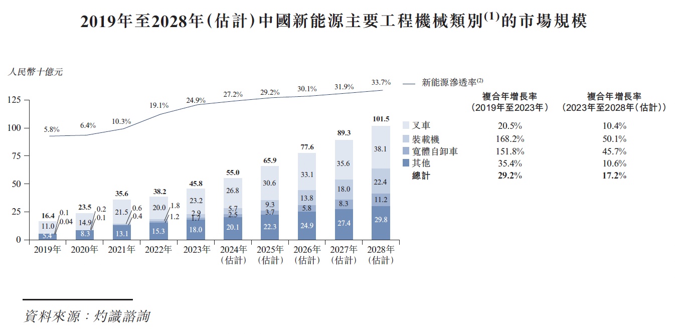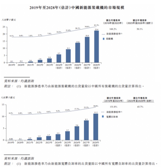 根据招股书,灼识咨询预测2023-2028年我国新能源装载机及新能源宽体自卸车的市场规模的复合年增长率会分别达到50.1%、45.7%,增速均显著高于工程机械行业大盘增长表现。