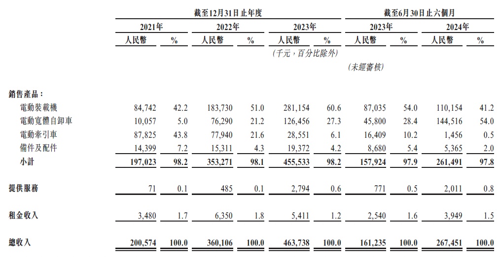 根据招股书,2021年时博雷顿的收入大头主要来源于销售电动装载机和电动牵引车,其中后者收入占比达到了43.8%,为彼时公司第一大产品。不过到了2023年,电动装载机已成为公司贡献收入最多的产品,占比约60.6%;其次是电动宽体自卸车,占比27.3%;而电动牵引车收入已由两年前的近9000万元萎缩至2855.1万元,占比6.1%。