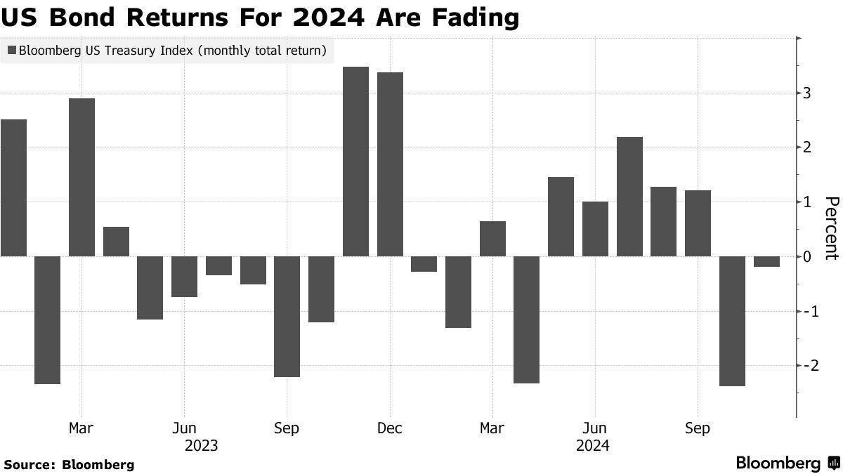 特朗普即将重返白宫极大地改变了美债市场的前景,10月的下跌已经导致今年的大部分涨幅被抹去。在美联储开始将联邦基金利率从20多年来的高点开始下调不到两个月后,特朗普对内减税、对外征收高额关税的可能性有可能通过提高进口成本和向本已强劲的经济注入刺激措施导致通胀卷土重来。他的财政计划也会导致联邦预算赤字激增,这反过来又让人再次怀疑,债券持有人是否会开始要求更高的收益率,以换取吸收不断增加的新美债供应。