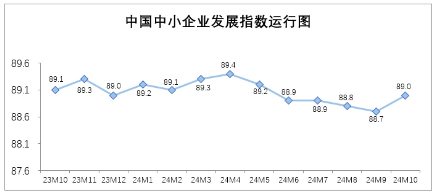 智通财经APP获悉,11月11日,中国中小企业协会发文称,10月中小企业发展指数为89,较9月上升0.3点,为今年最大升幅,也是2023年3月以来最大升幅。其中,分项指数全面上升。分行业指数6升2降。10月份,反映企业预期的宏观经济感受指数为98.8,较上月上升0.6点。从细项看,宏观形势感受指数为103.4,比上月上升0.6点。行业形势感受指数为94.1,比上月上升0.5点。在一揽子增量政策带动下,市场信心和经济运行明显提振。