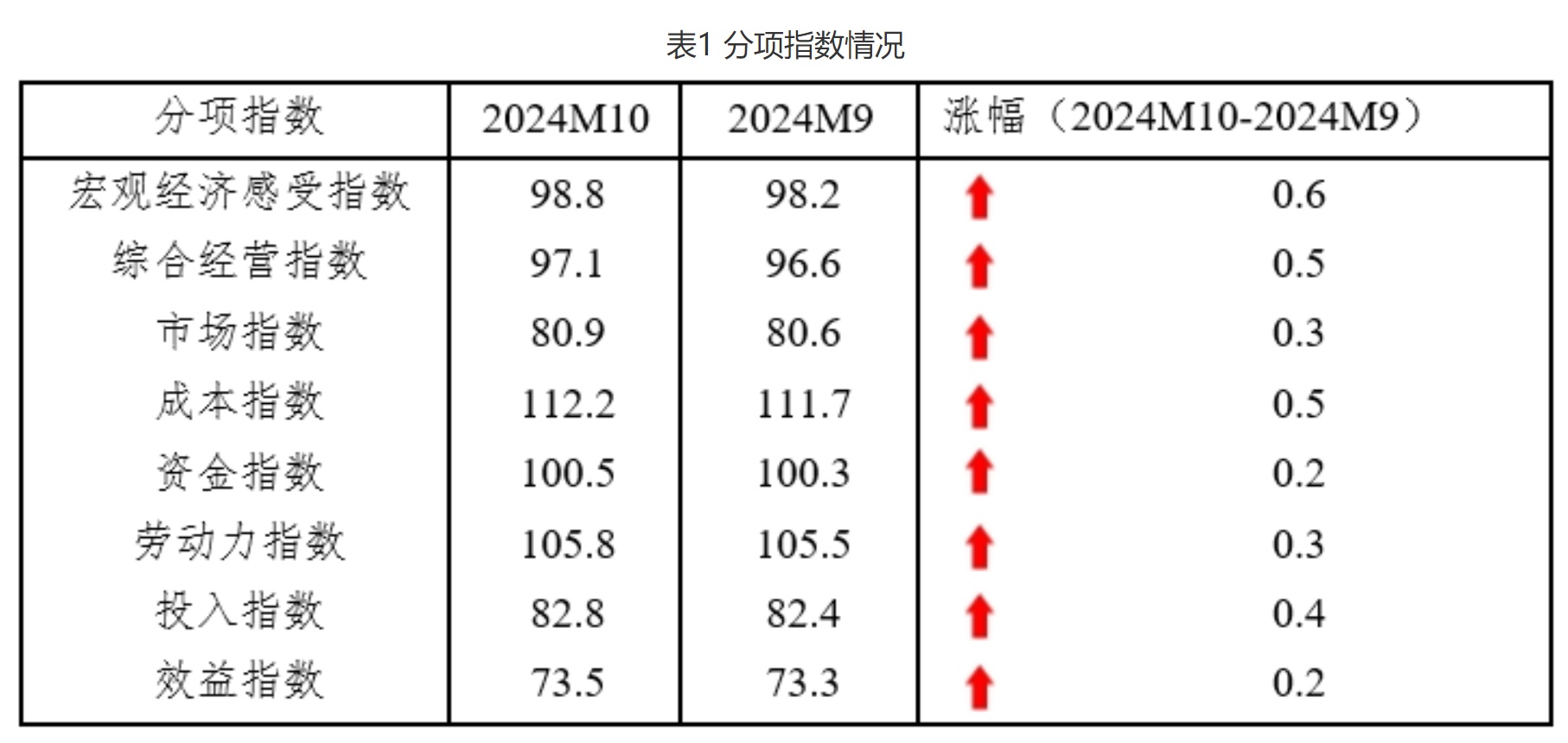 发展预期向好。10月份,反映企业预期的宏观经济感受指数为98.8,较上月上升0.6点。从细项看,宏观形势感受指数为103.4,比上月上升0.6点。行业形势感受指数为94.1,比上月上升0.5点。在一揽子增量政策带动下,市场信心和经济运行明显提振。