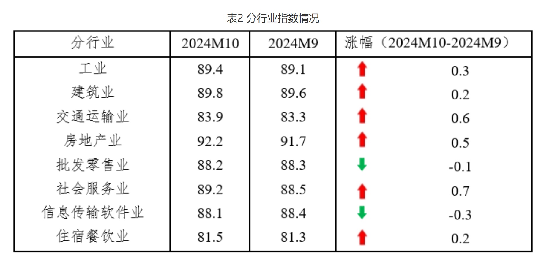分行业指数6升2降。如下表所示,10月份,工业、建筑业、交通运输业、房地产业、社会服务业、住宿餐饮业均有所上升。相比9月,工业指数延续上升态势,较上月上升0.3点。建筑业、交通运输业、房地产业、社会服务业、住宿餐饮业由降转升,分别较上月上升0.2、0.6、0.5、0.7和0.2点。批发零售业、信息传输软件业指数由升转降,较上月下降0.1和0.3点。总体来看,行业表现回升向好。
