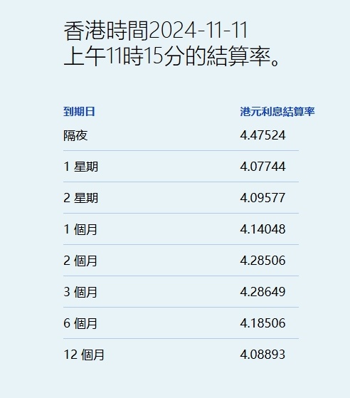 智通财经APP获悉,11月11日,港元隔夜息今早急升近50基点至4.47524%,再创本月新高,但其余各期拆息无大变动。与楼按相关的一个月拆息连升三天,报4.14048%,为11月1日以来最高。