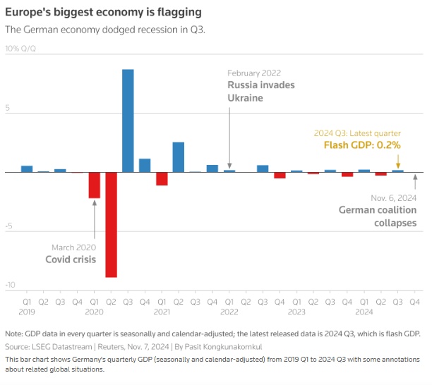 雪上加霜的是,德国总理朔尔茨周三解雇了财政部长,结束了几个月来围绕预算政策和经济方向的争论,执政联盟宣告瓦解。