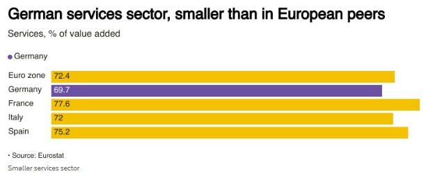 根据欧盟统计局的数据,去年服务业占德国国内生产总值(GDP)的70%,而法国为78%,意大利为72%,西班牙为75%。