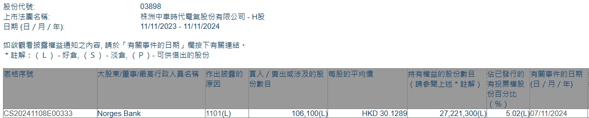 智通财经APP获悉,香港联交所最新资料显示,11月7日,挪威中央银行增持时代电气(03898)10.61万股,平均每股作价为30.1289港元,总金额约为319.67万港元。增持后最新持股数目为2722.13万股,最新持股比例为5.02%。