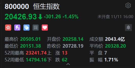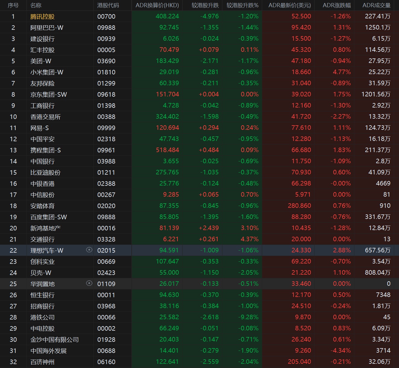 智通财经APP获悉,周一美股三大指数齐涨,恒生指数ADR下跌,按比例计算,收报20426.93点,较香港收市下跌301.26点或1.45%。
