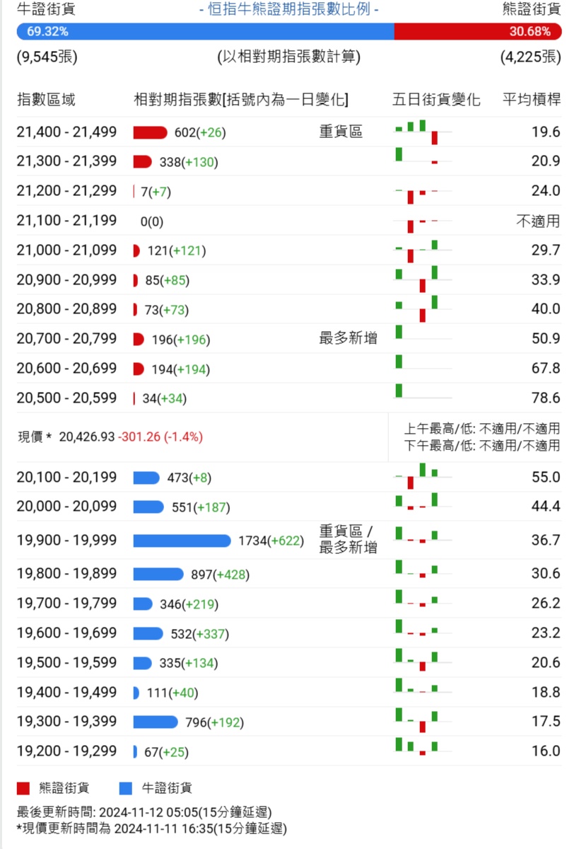 智通财经APP获悉,截至11月12日,恒指最新的牛熊街货比例为69:31。