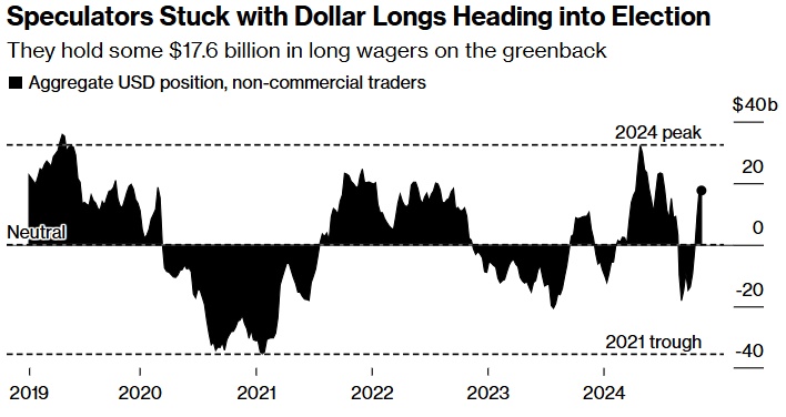 美国商品期货交易委员会(CFTC)周五公布的数据显示,截至11月5日的一周内,对冲基金、资产管理公司和其他投资者持有约176亿美元的看涨美元头寸。这一定位标志着10月中旬大选前的负面前景出现逆转。