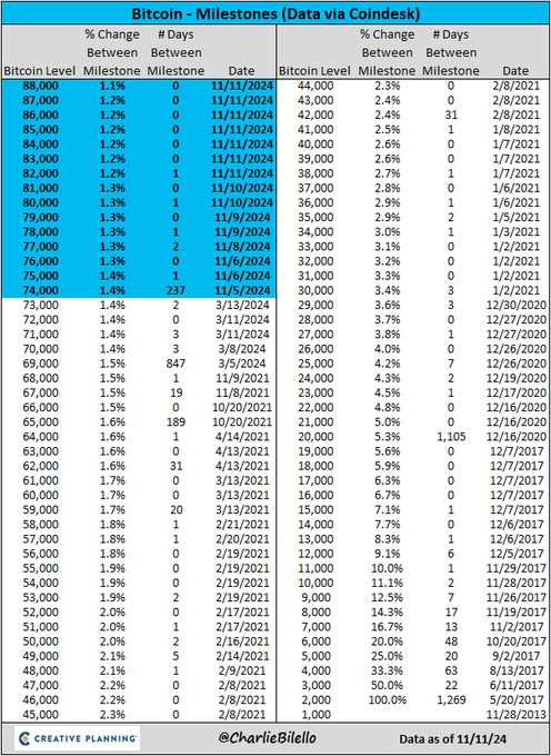 而最后,比44000还要高出一倍的数字88000(美元),则是比特币在昨夜最新捅破的整数关口。美国当选总统特朗普对数字资产的支持立场,及国会有不少议员支持加密货币的前景,一同推动比特币首次升破了这一整数大关。事实上,从11月5日的大选日算起,比特币在短短几个交易日的时间里,就已先后升破了14道整数大关(以千美元衡量)。