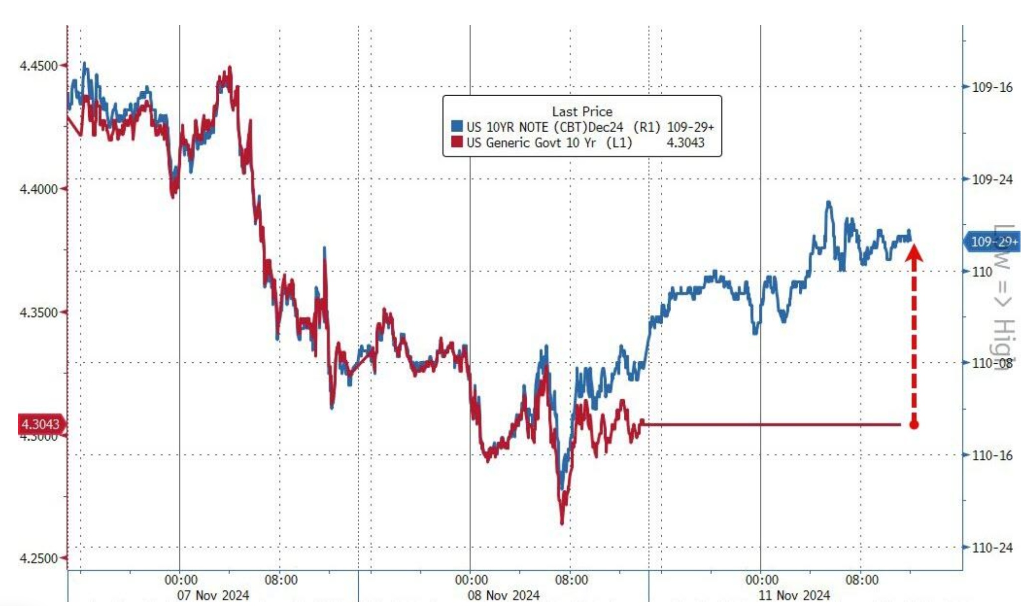 美国国债现货市场周一因退伍军人日而休市。但期货市场仍显示出一些明显的抛售压力。截止纽约时间周一下午3:30,10年期美国国债期货下跌约11点,隐含的收益率水平约为4.35%。如果在周二亚洲市场开始交易时维持这一水平,意味着10年期国债收益率将比周五收盘高大约5个基点。