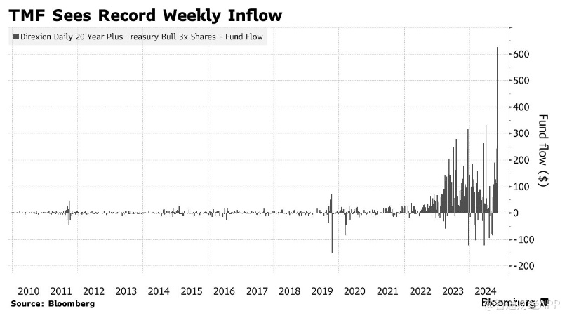不过,到目前为止,TLT在2024年已经吸引了大约140亿美元,这将是该基金成立以来第三大的年度资金流入。TMF吸引了超过33亿美元的资金,是有史以来第二大年度资金流入。