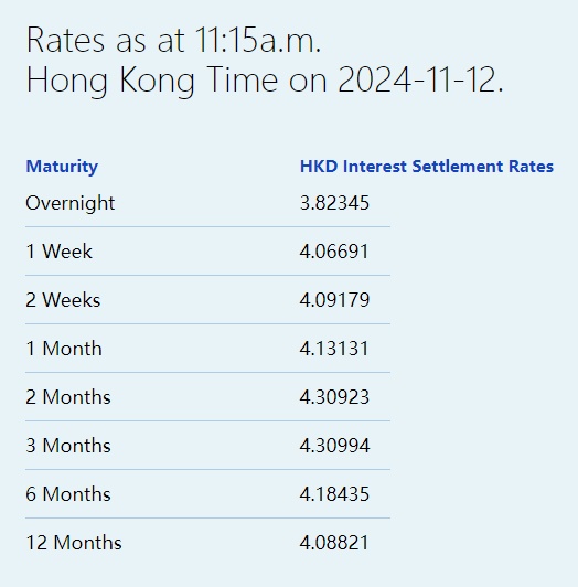 智通财经APP获悉,11月12日,港元拆息普遍走低,其中,隔夜拆息由本月高位大幅回落65基点至3.82345%,与楼按相关的一个月拆息亦结束三连升,微跌至4.13131%。