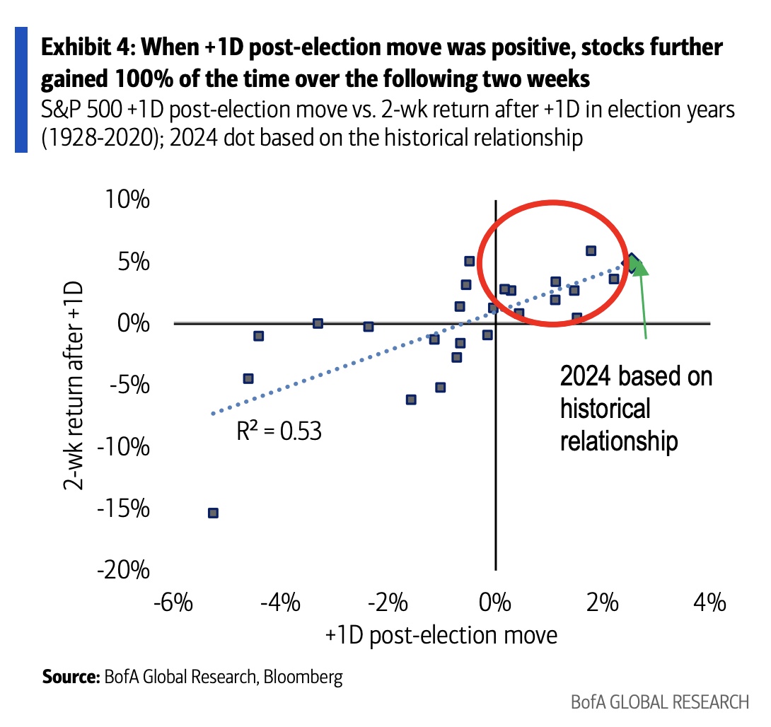 智通财经APP获悉,美国银行的数据显示,标普500指数上周在美国大选后的第二天飙升了2.5%,根据历史经验,这可能导致该股指在未来两周上涨近5%。而自选举后至本周一的交易时段来看,该指数已上涨了1.2%。