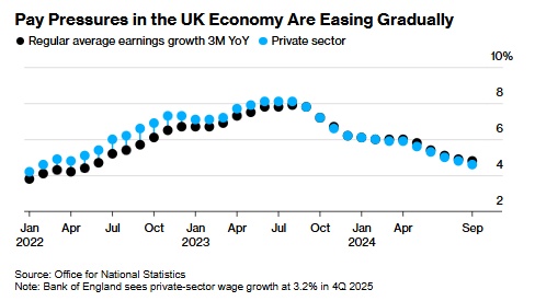 Bloomberg Economics的Ana Andrade和Dan Hanson表示:“9月私营部门薪酬增长的粘性证明了英国央行谨慎的宽松政策是正确的。随着最近的预算也进一步增加了物价和工资设定行为的风险,我们认为央行将在未来一年继续以每季度一次的步伐进行降息。”