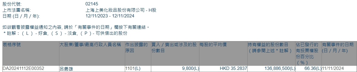 智通财经APP获悉,香港联交所最新资料显示,11月11日,董事长兼首席执行官吕义雄增持上美股份(02145)0.98万股,每股作价35.2837港元,总金额约为34.58万港元。增持后最新持股数目约为1.37亿股,持股比例为66.36%。