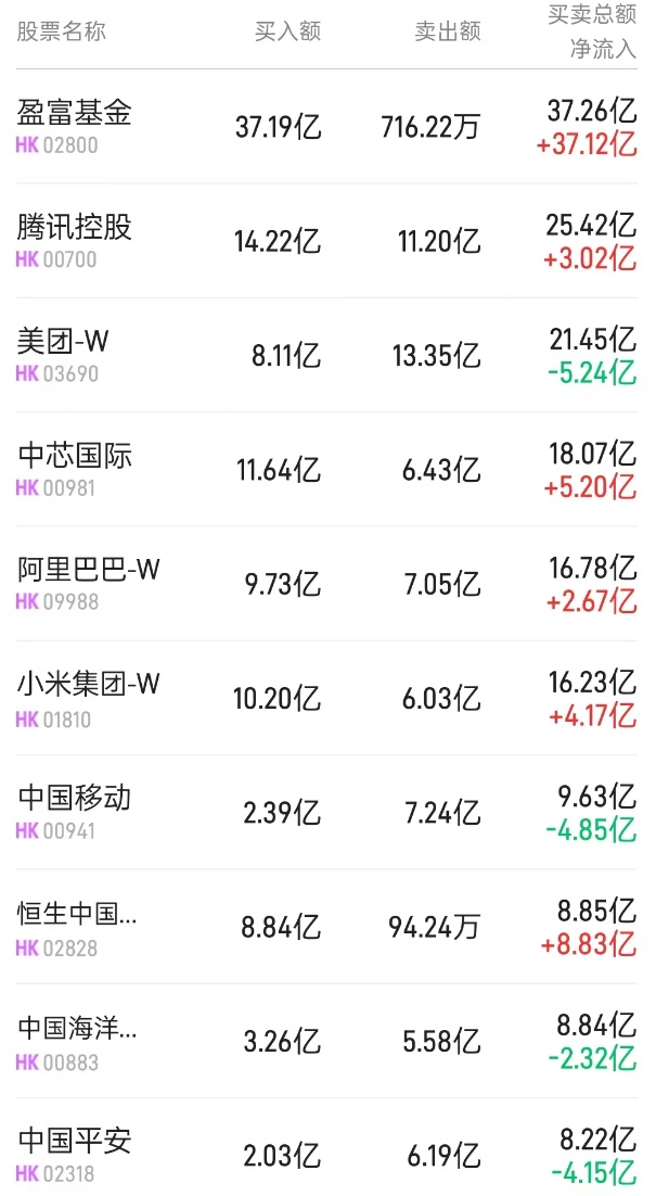 北水净买入最多的个股是盈富基金(02800)、恒生中国企业(02828)、小米集团-W(01810)。北水净卖出最多的个股中国移动(00941)、中芯国际(00981)、融创中国(01918)。