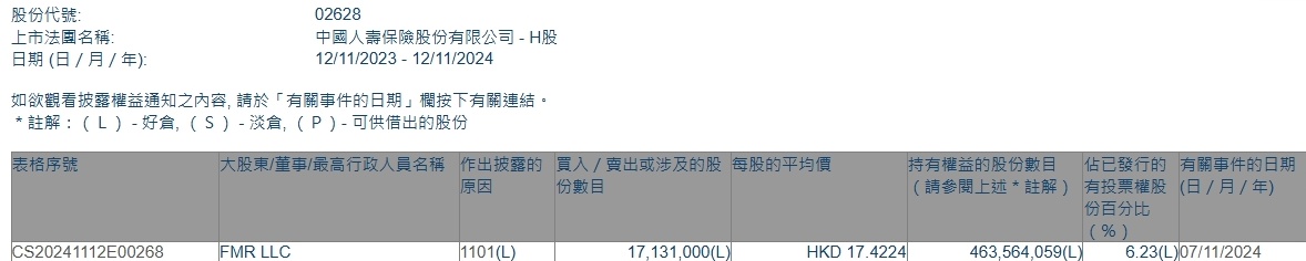 智通财经APP获悉,香港联交所最新资料显示,11月7日,FMR LLC增持中国人寿(02628)1713.1万股,每股作价17.4224港元,总金额约为2.98亿港元。增持后最新持股数目约为4.64亿股,最新持股比例为6.23%。