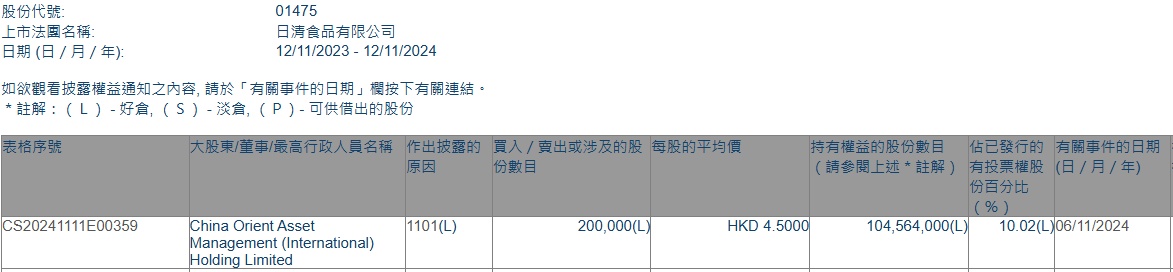 智通财经APP获悉,香港联交所最新资料显示,11月6日,China Orient Asset Management (International) Holding Limited增持日清食品(01475)20万股,每股作价4.5港元,总金额为90万港元。增持后最新持股数目约为1.05亿股,最新持股比例为10.02%。