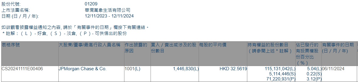 智通财经APP获悉,香港联交所最新资料显示,11月6日,小摩增持华润万象生活(01209)144.683万股,每股作价32.5619港元,总金额约为4711.15万港元。增持后最新持股数目约为1.15亿股,最新持股比例为5.04%。