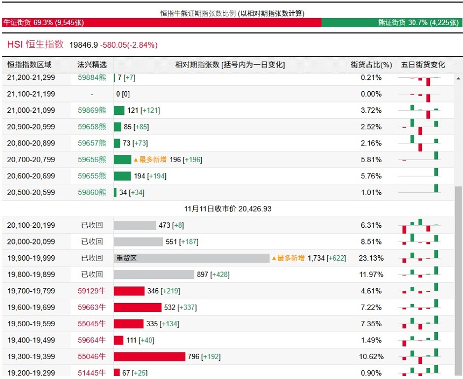 智通财经APP获悉,11月12日,港股大盘出现大幅回落,全天维持震荡下跌态势,截至收盘,恒生指数跌破20000点,报收于19846.88点,跌幅达2.84%,期间最低价为19761.31点。恒生科技指数跌幅达4.19%。受港股暴跌影响,香港证券市场数百只牛证被强制收回,终止交易。