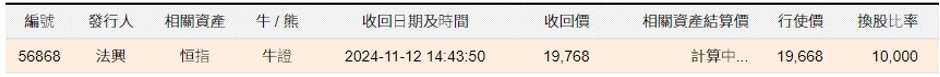 以恒指法兴七七牛U(56868)为例,在11月12日14:43:50时,由于恒指跌穿其收回价19768点,导致该牛证被强制收回,终止交易,投资者只能从发行商那里拿回极少投入资金。