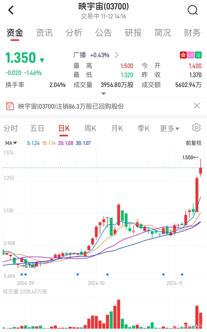 智通财经APP注意到,港股加密货币概念——映宇宙(03700),近期股价频频异动上涨,均线已呈“多头排列”。11月11日,映宇宙股价大涨20.18%至1.37港元,创2023年3月以来新高;11月12日,公司股价盘中一度突破至1.5港元,年内最大涨幅达到134.7%。