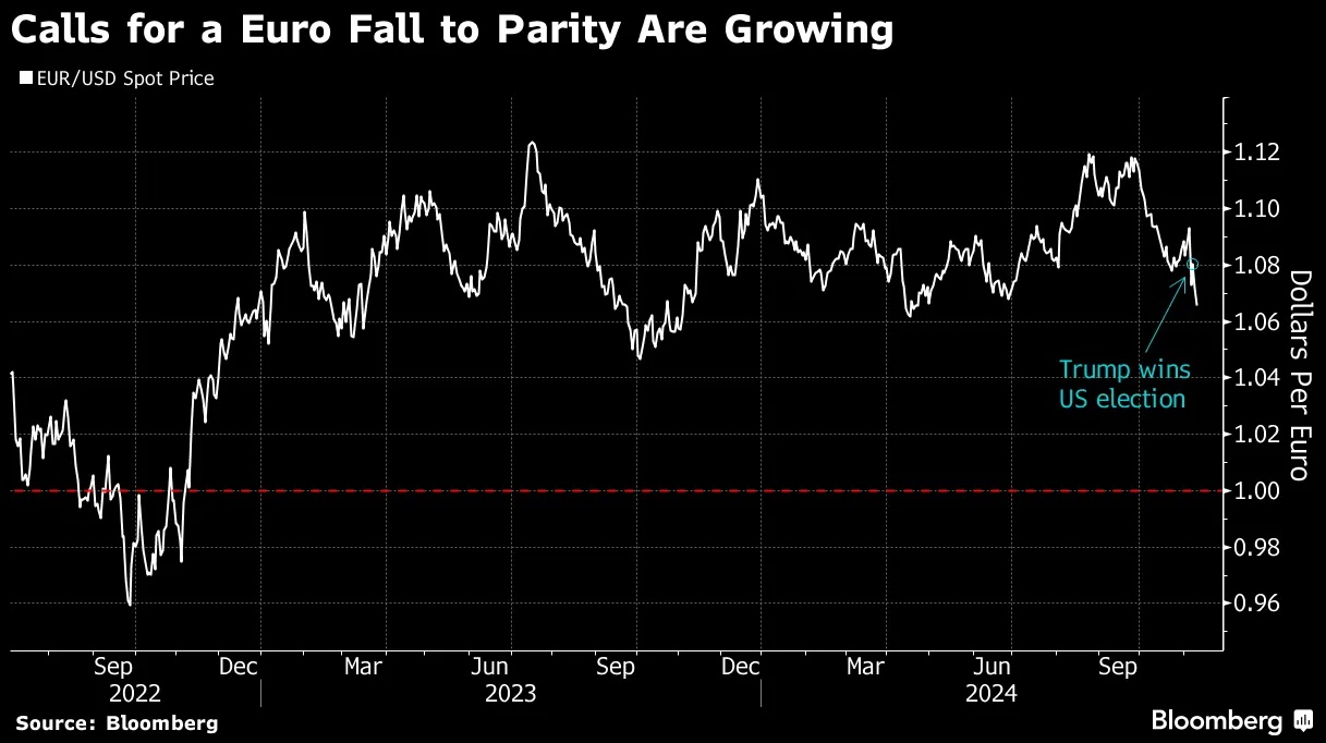 货币市场格局的变化主要源于人们对特朗普重返白宫后全球贸易限制可能成为其经济政策关键支柱的预期。这促使投资者抛售欧元,因为关税将损害欧洲出口产业,而欧洲主要经济体又面临政治不确定性。自特朗普胜选以来,欧元已下跌近3%,接近今年的低点。