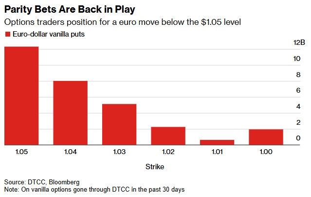 期权市场也预示着欧元将进一步走弱。数据显示,上个月约有20亿欧元押注于明年欧元兑美元汇率将跌至1美元的普通期权。同时,对冲基金和其他杠杆投资者对欧元贬值的押注已经徘徊在三年来的最高水平,并可能在此后激增。